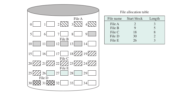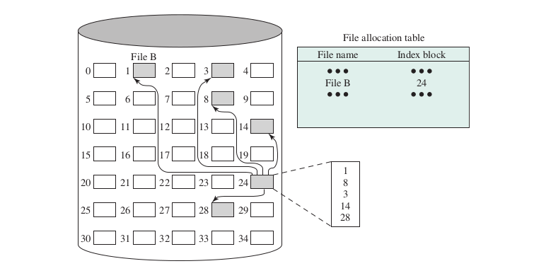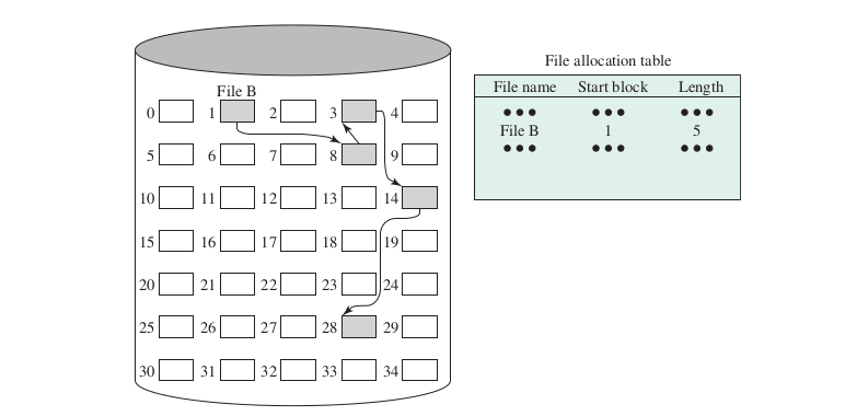 - Requires a disk allocation table to keep track of what blocks on the disk are available