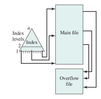 - An overflow file similar to the log file used with sequential file but is integrated so that a record in the overflow file is located by following a pointer from its predecessor record